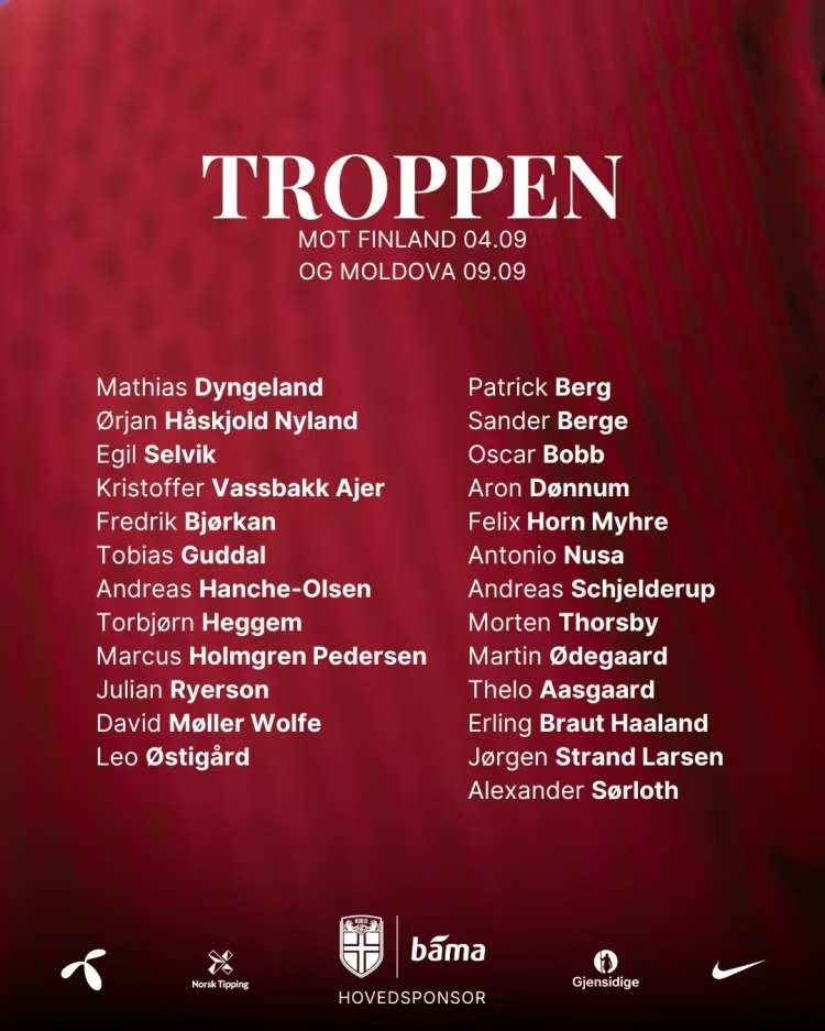 挪威队世预赛大名单:哈兰德&厄德高领衔,瑟洛特、努萨在列