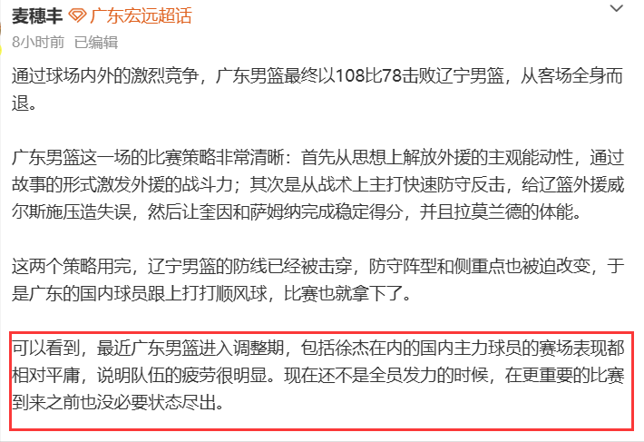 麦记所言非虚,也是相对客观的说出了广东队目前的处境,尽管昨晚广东轻松大胜了辽宁,但其实球队现在还没有达到最佳状态,徐杰和胡明轩其实都比较疲劳,胡明轩膝盖有伤一直是边打边养,徐杰近期也是换上了流感,身体状况比较一般,辽粤战虽然是传统恩怨局,广东队赛前无论是备战还是从球员采访中都能看出他们对这场比赛的重视程度,但理性来说,现在并不是广东队全员发力的时候,毕竟还有2/3的赛程要打,没必要在这种时候发挥出全力,把对手打急眼,以免影响了后续的比赛,您觉得呢?